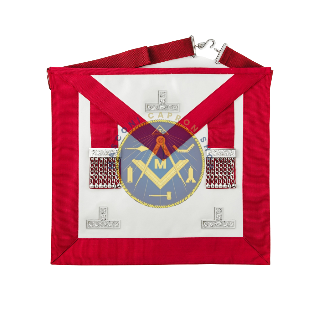 This provincial stewards apron with levels is manufactured with the combination of dark red colour moire ribbon, fine lambskin leather or imitation leather, set of three metal levels stitched on apron, pair of silver chromed tassels and snake shaped silver chromed belt metal parts. The apron comes with pocket at rear and the belt is adjustable up to 46″ waist size. Size of the apron is 16 X 14 inches
